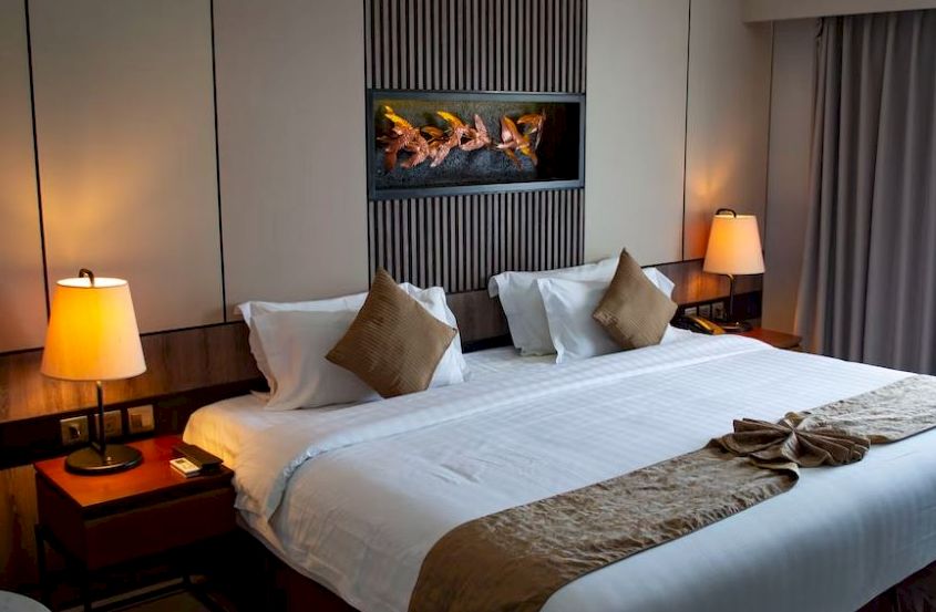 The image shows a neatly arranged hotel room with a large bed, stylish lamps, and decorative pillows, creating a cozy and inviting atmosphere.