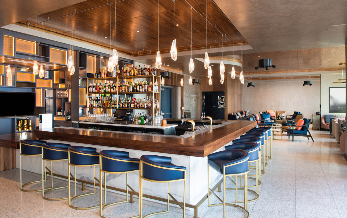 The image shows a modern bar with a central counter, blue stools, hanging lights, and shelves stocked with bottles.