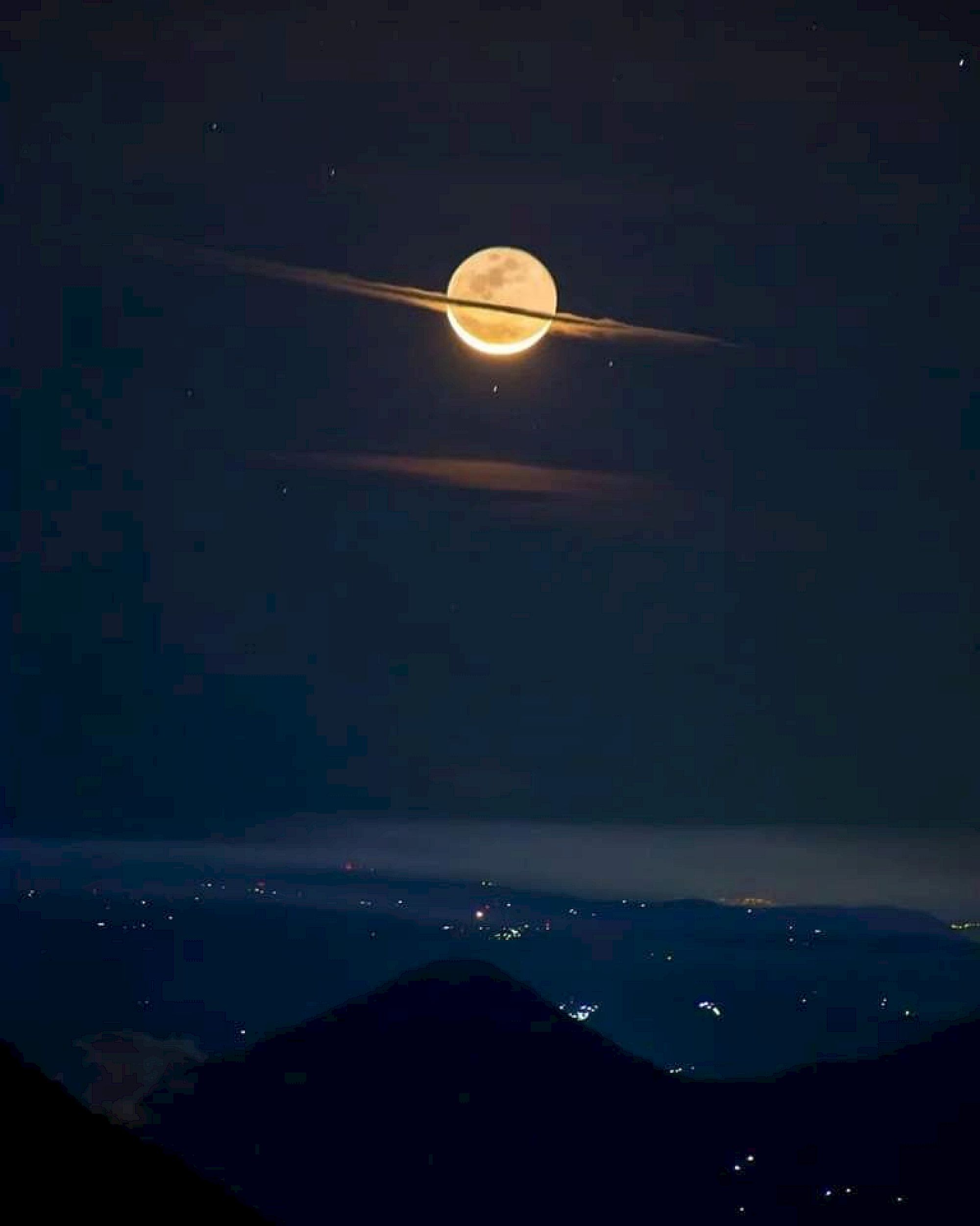 A serene nighttime landscape with a mountainous silhouette under a starry sky and a glow from the horizon.
