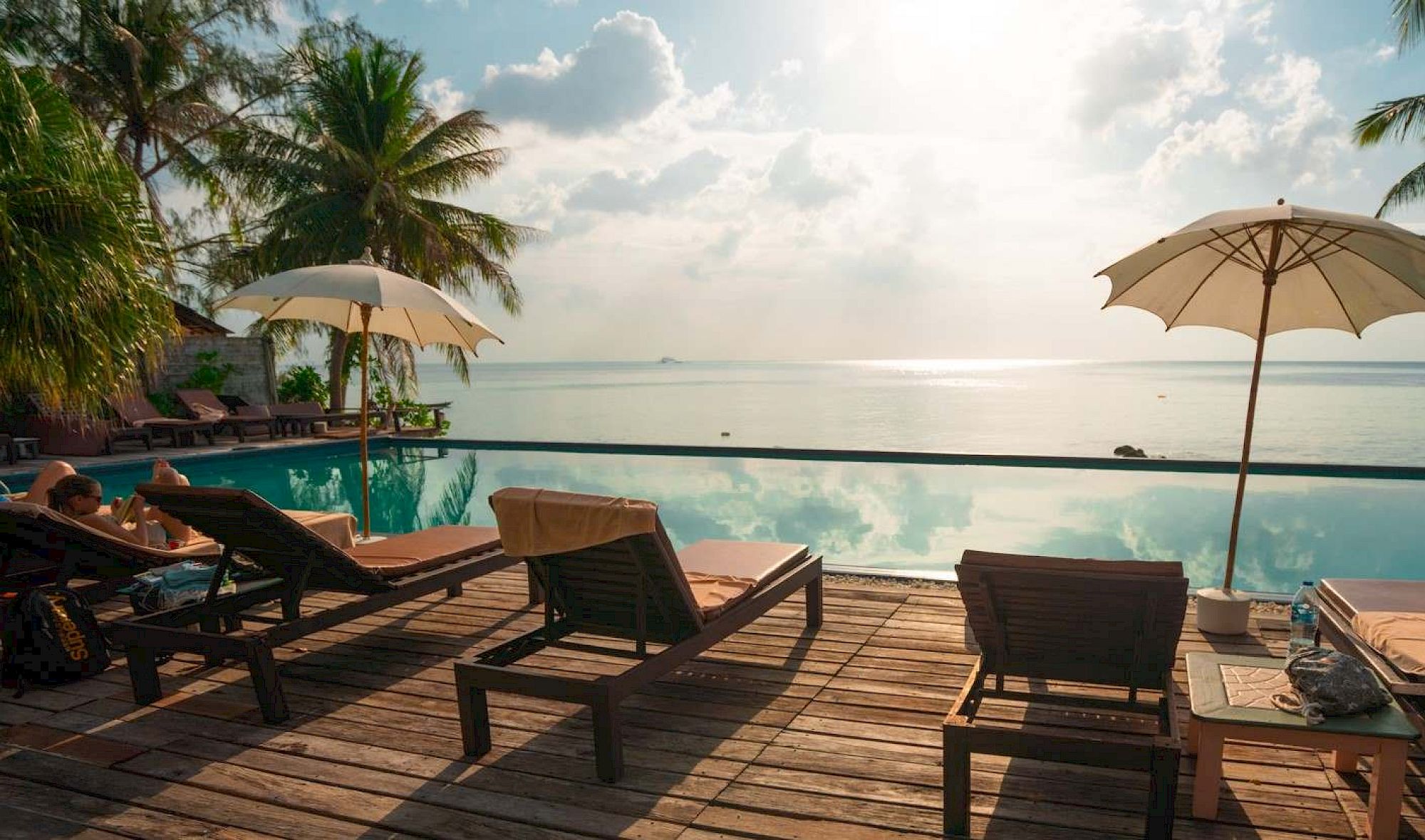 • The image shows a serene poolside scene with lounge chairs, umbrellas, and a view of the ocean under a partly cloudy sky.