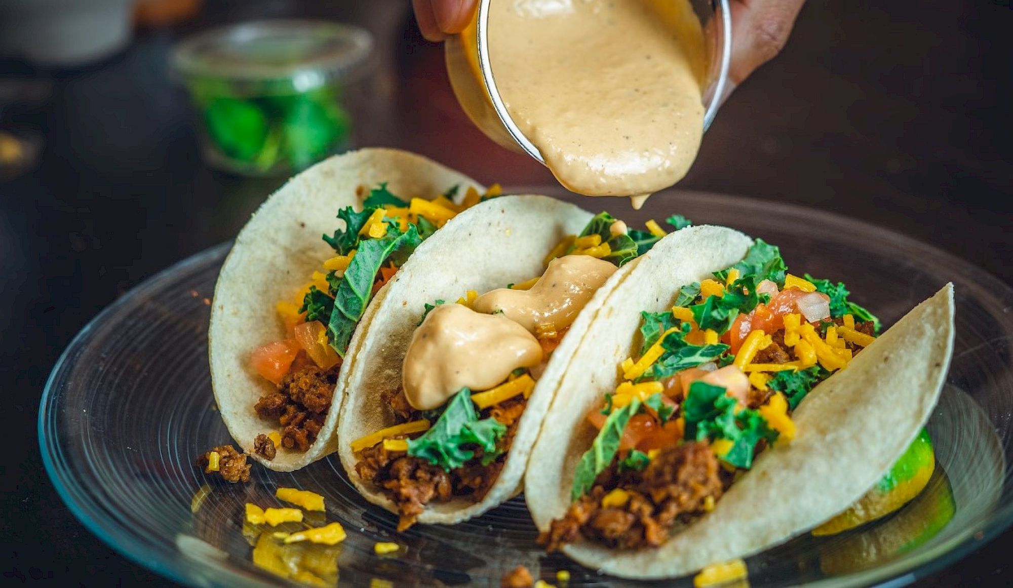 Three tacos filled with ground meat, cheese, and greens are on a plate; sauce is being poured over the middle one.