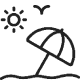 Sunlit beach scene with loungers, umbrellas, and palm trees overlooking a tranquil sea and clear sky.