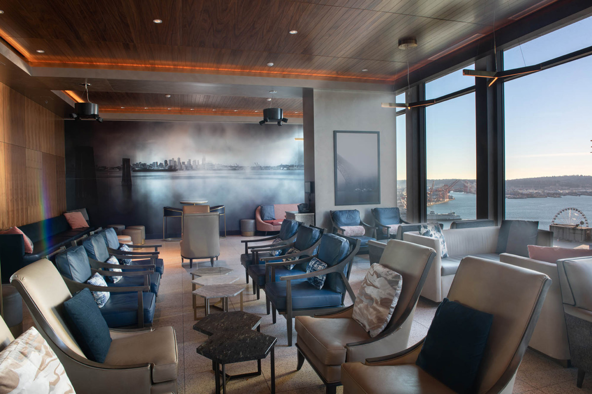 The image shows a modern rooftop terrace with seating, overlooking a cityscape of tall buildings at twilight.