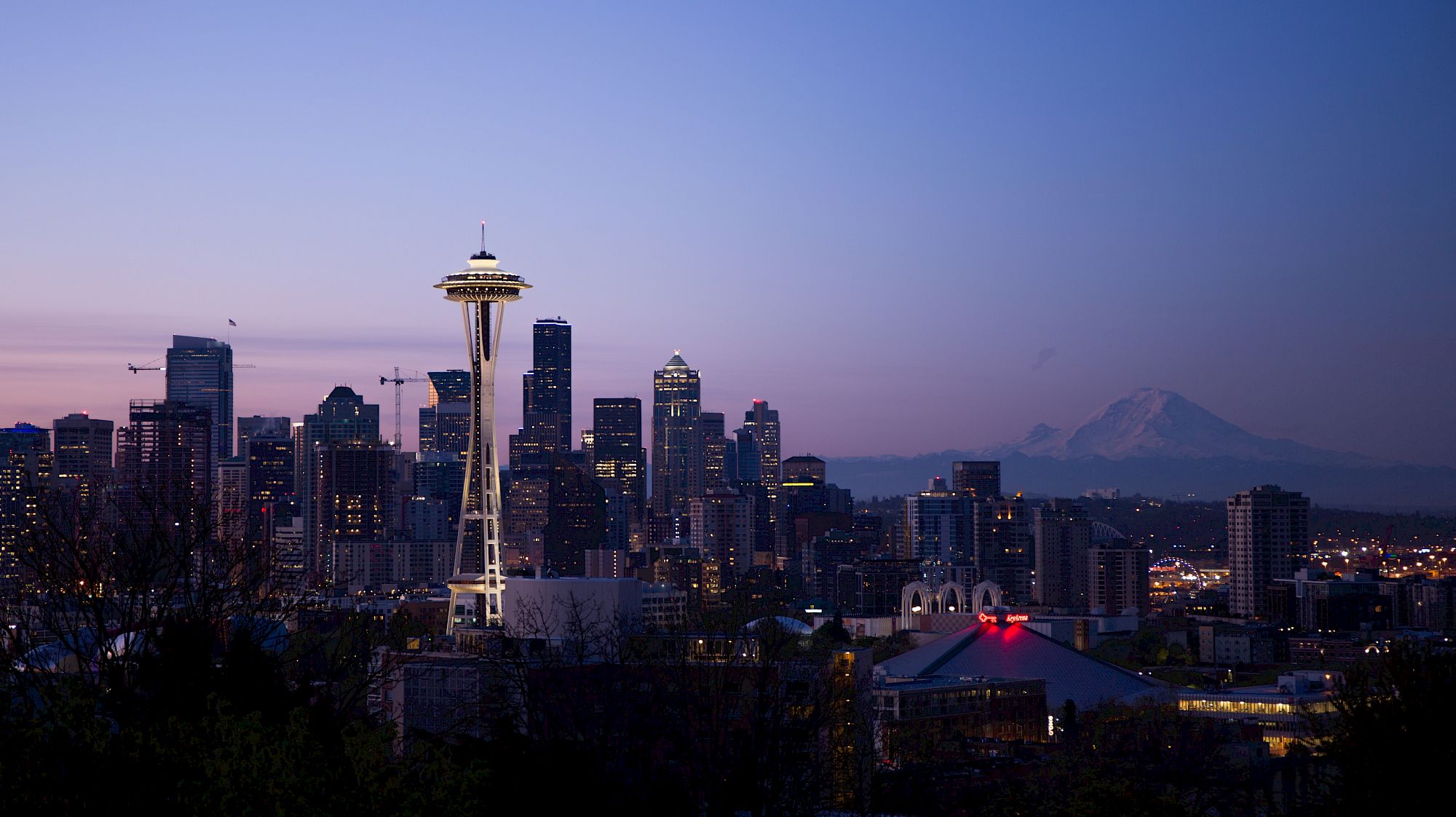 The image shows the Space Needle in Seattle with a backdrop of modern skyscrapers and cloudy skies.